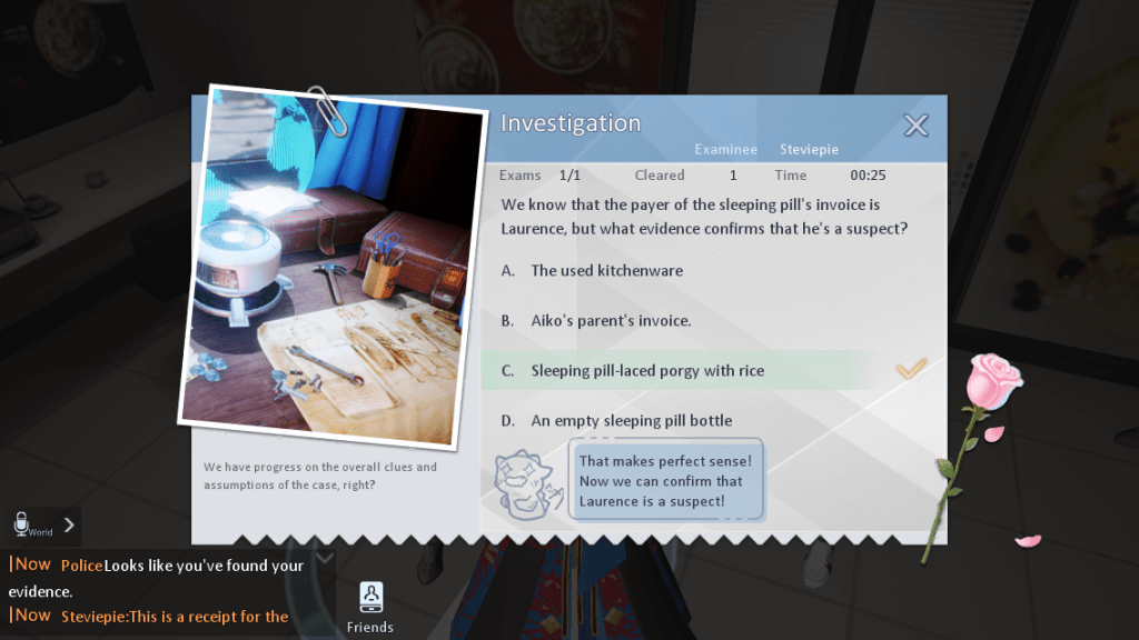 Then, head back to interact with the police who will now present you a question. The question asks you why Laurence is the suspect and the answer should be “Sleeping pill-laced porgy with rice”.