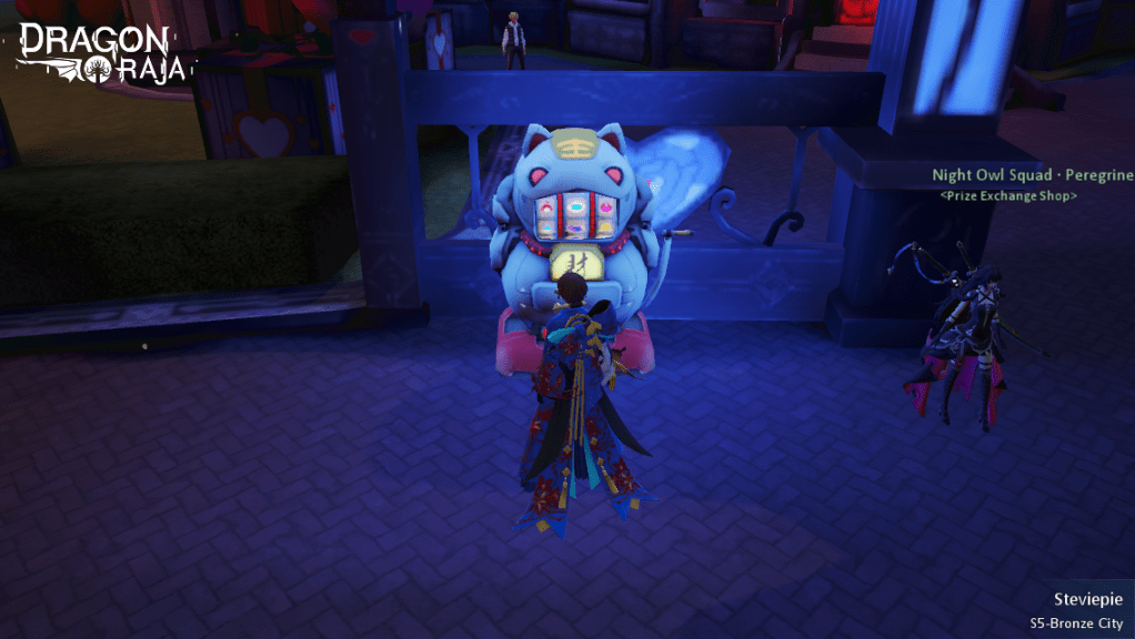 After you get a token drop (that is guaranteed on many of the world boss fight if you met the conditions and joined the fight on time), you can bring it over to a cat slot machine to trade it in for the specific boss’s coupon. These coupons can then traded for items through the store. Using the token item in your bag will auto-path you to the specific cat slot machine for the specific token. Using the coupons in your bag will auto-path you to the NPC where you can trade your coupons for cosmetics, titles, and transformations.