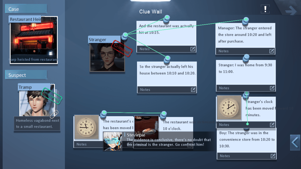 After gathering all your clues, open the clue wall. Clear out all the old clues and profiles if needed. Then, drag the stranger profile onto the board along with all the clues for the stranger (all the clues to do with time). Connect the clue about the time of theft with the clue of the clock time of the food stall to get a new lead. Then, connect the time of the clock inside the stranger’s house to the time that the young man said his father left the house to get another lead. Connect the new leads to the stranger profile, along with the convenience store owner’s testimony and you should be able to confirm the suspect.
