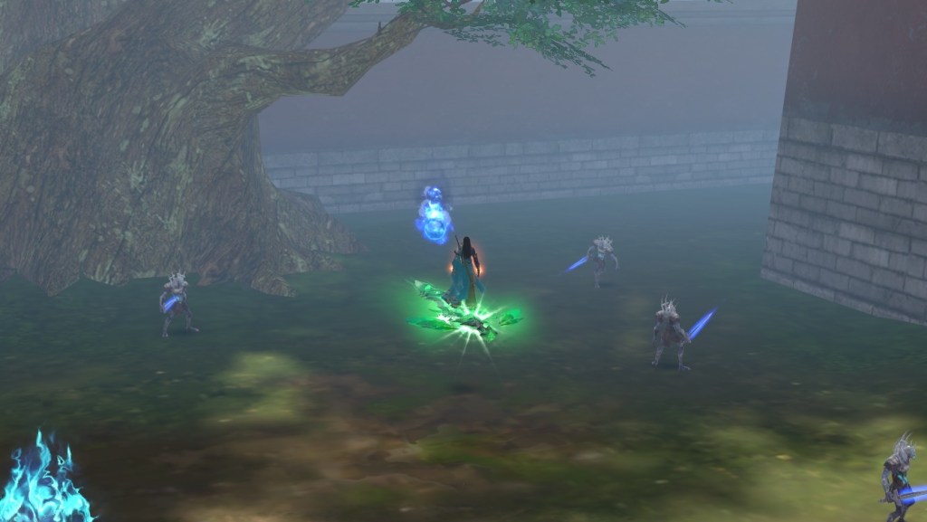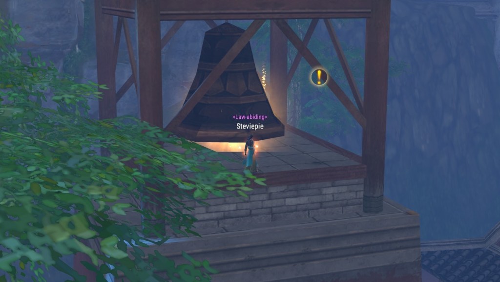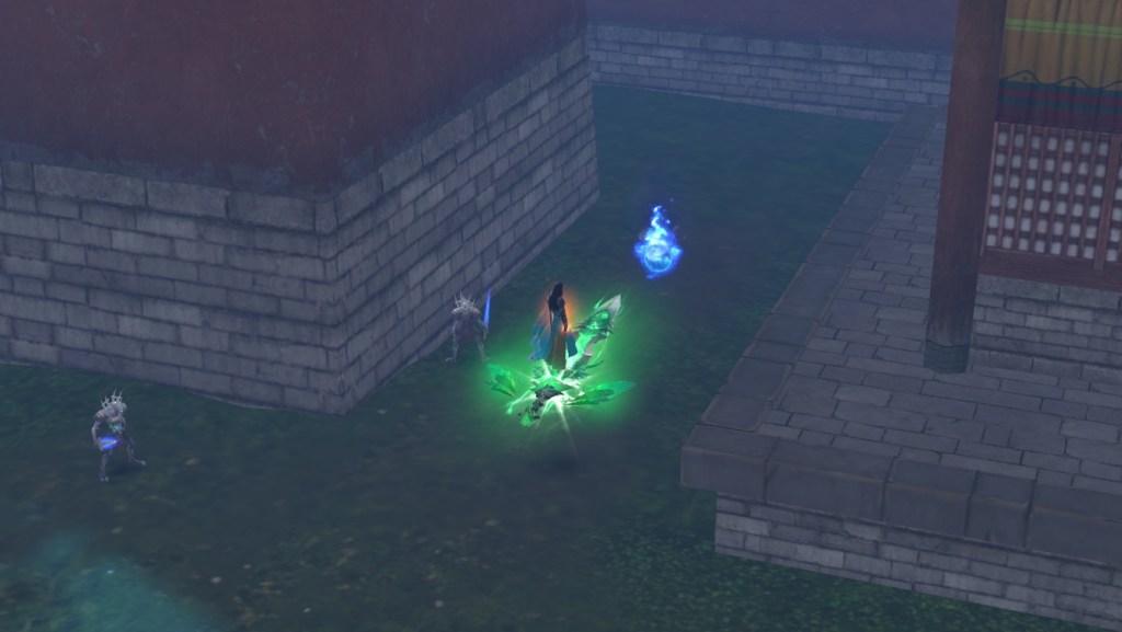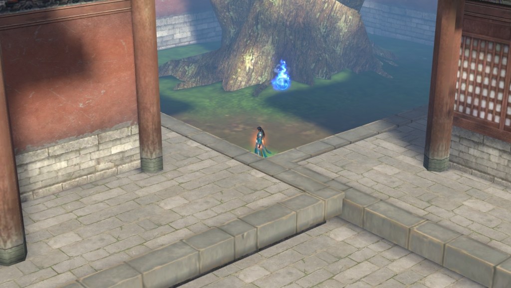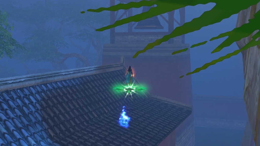 Talk to the flickering light to trigger the quest (please excuse faulty game logic). The next part of the quest then can be completed on auto-path and an easy fight will occur. After the fight, you will be required to find the soul of the Painted Skin without auto-path. Simply fly around (inside) the temple to find the souls (blue orbs) and interact with them. There is one around the corner by the walls next to the bell tower, two by a different tree each, and two on top of the rooftop of the buildings facing each other.