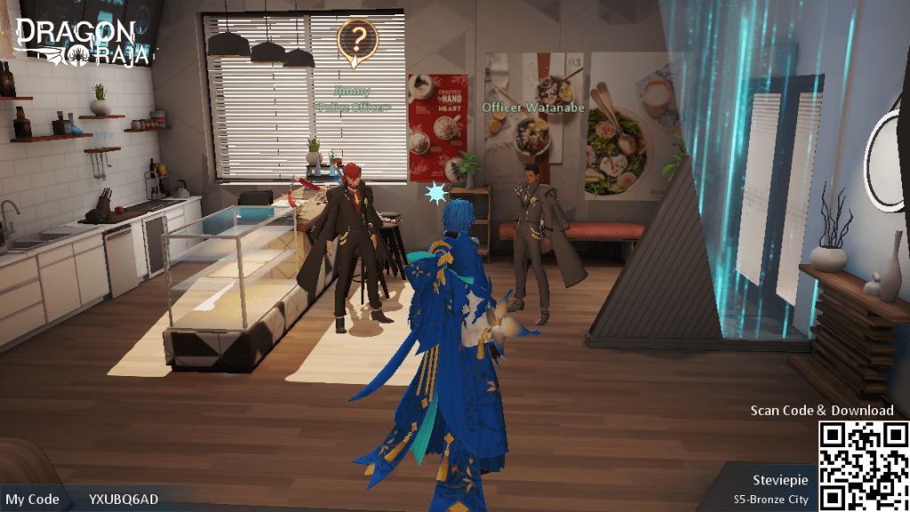 After they run off, Officer Watanabe (with a quest mark) will spawn nearby. Talk to him and you will be brought into a level 1 (beginner) shop look-alike with Jimmy the police officer NPC (with quest mark) nearby. Talk to Jimmy and go through the dialogue.
